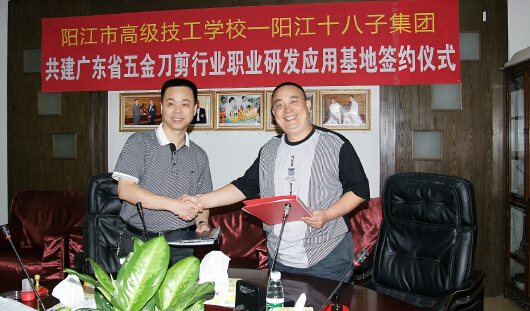 近日,陽江十八子集團總經理李積回與陽江市高級技工學校校長雷自南在陽江十八子科研大樓會議就雙方合作共建廣東省五金刀剪行業職業研發應用基地一事簽定校企合作簽議書。